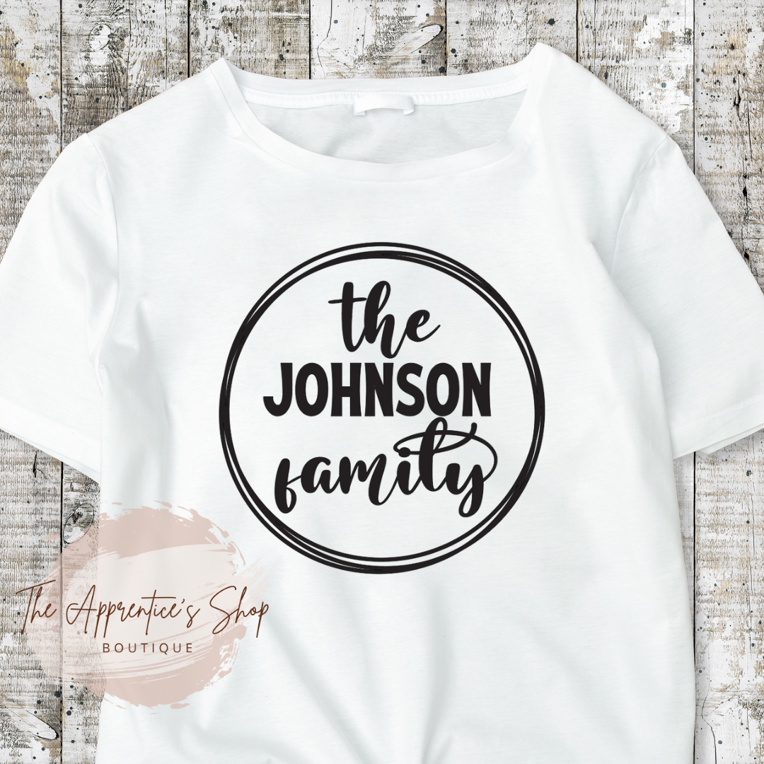 Get your customized family shirts. Let us know your family name, email it to us at info@theapprenticesshop.com, be sure to include your invoice number.